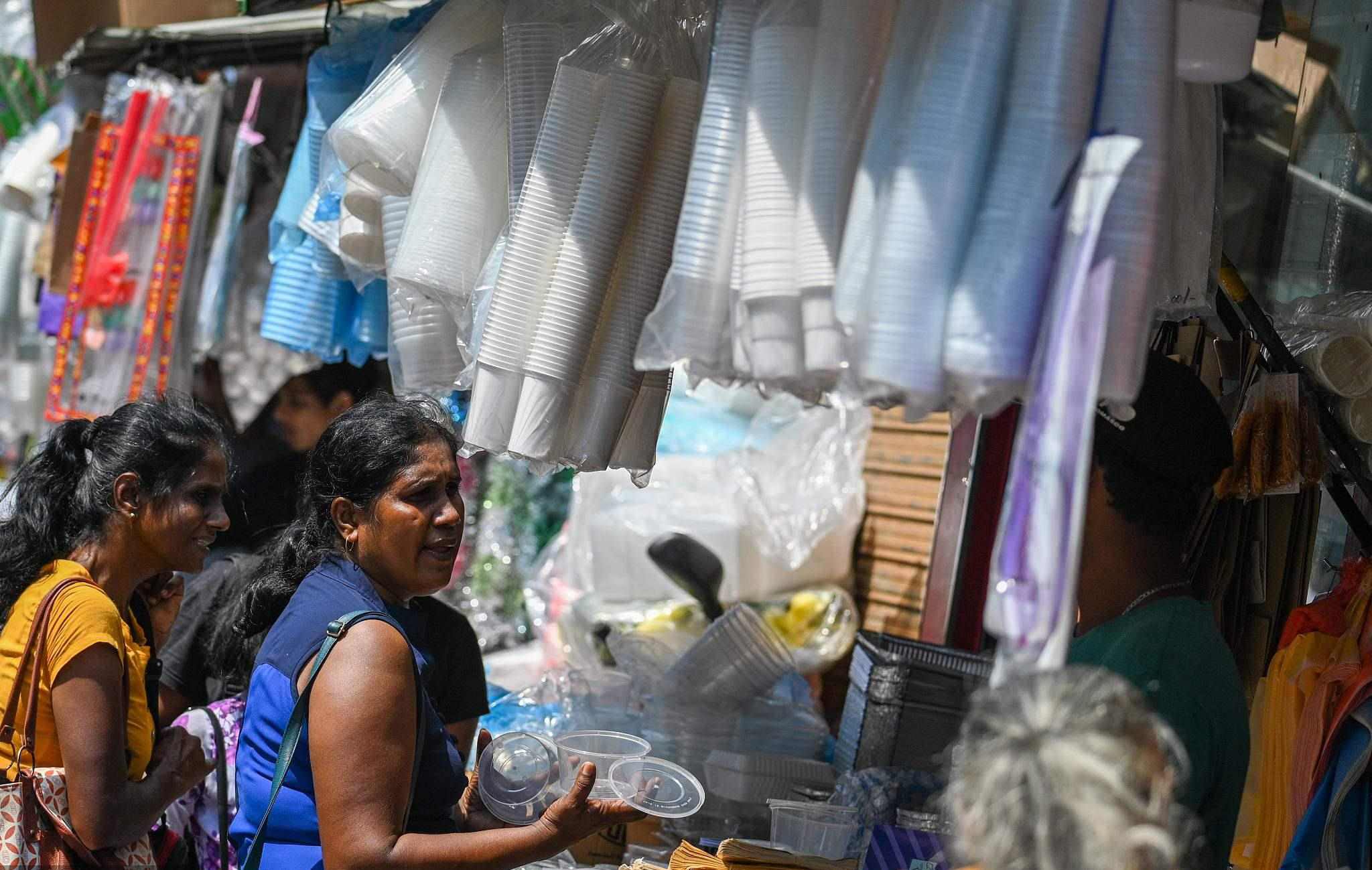 當地時間2023年2月14日,斯里蘭卡科倫坡市場的一家商店里,顧客在購買塑料餐具。