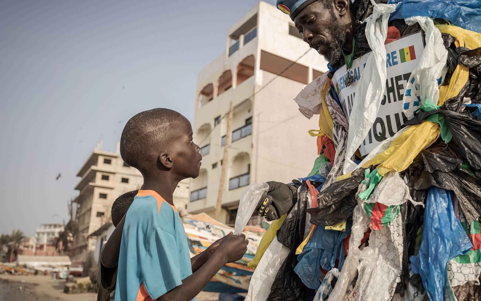 當地時間2023年4月5日,塞內加爾達喀爾,49歲的塞內加爾環(huán)保活動家莫杜·法爾,被稱為“塑料人”,和一個孩子在海灘上散步時拿著一個塑料包裝,提醒人們注意使用一次性塑料的污染。