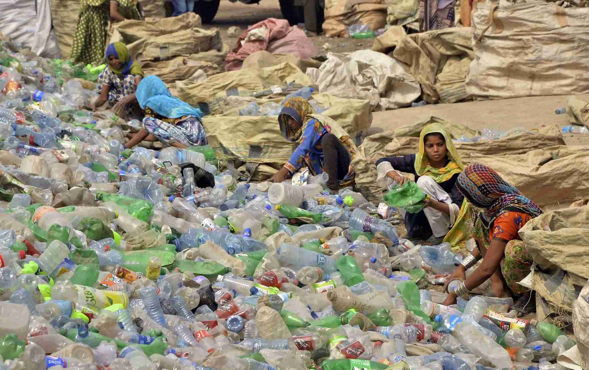 當地時間2023年4月30日,巴基斯坦海得拉巴,婦女們在一家塑料回收工廠里整理空瓶子。