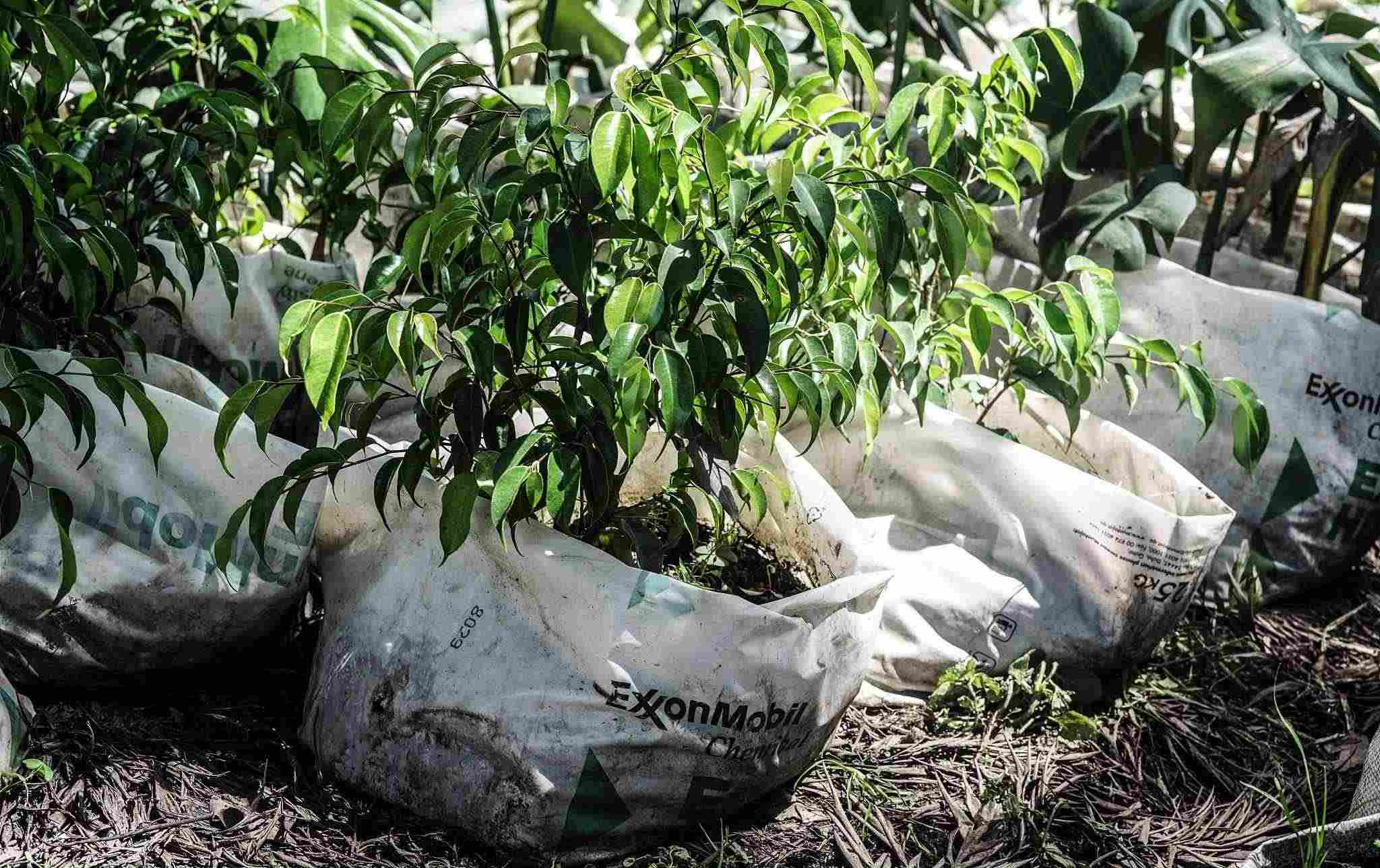 當地時間2023年5月7日,肯尼亞納庫魯的苗圃里,??松梨诎b袋包裹著一棵樹苗。隨著世界充斥著塑料廢物,政府間談判委員會(INC)內塑料條約的支持者正在倡導一項具有法律約束力的文書,減少石化工業(yè)生產的原生塑料。