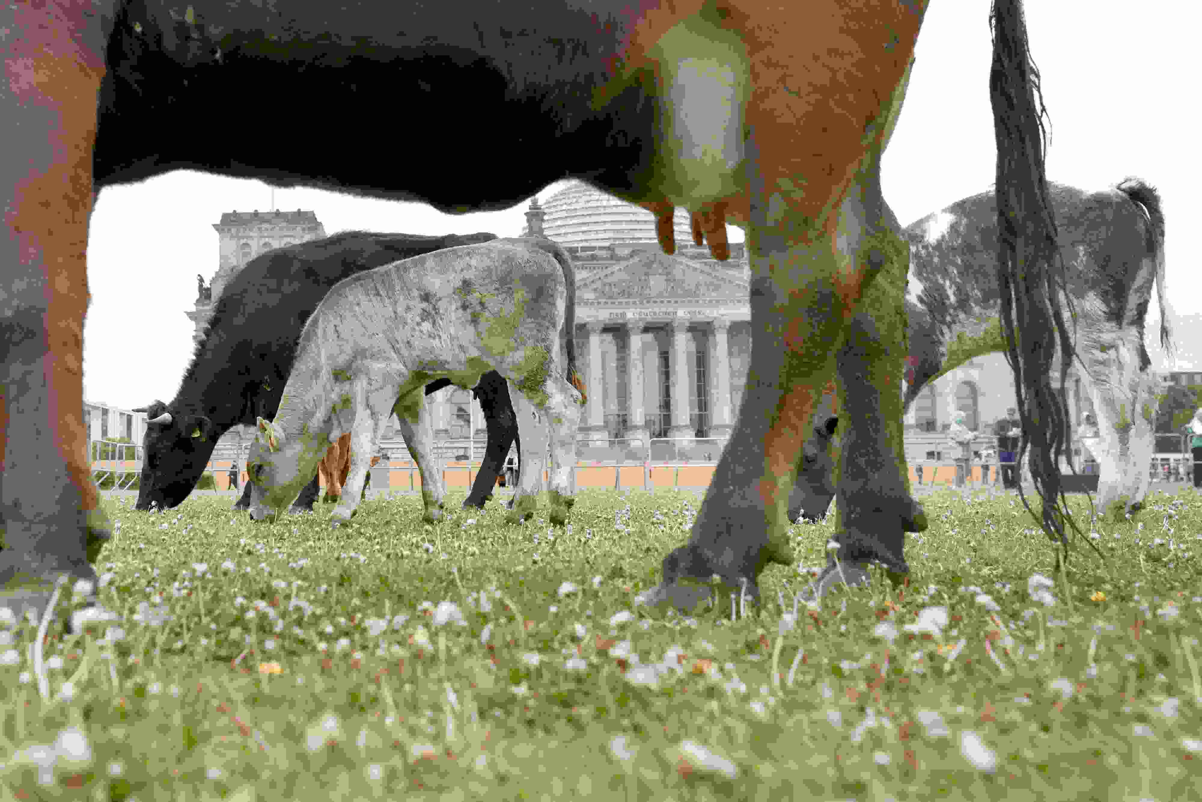 當(dāng)?shù)貢r(shí)間2023年5月16日,德國(guó)柏林,牛群被驅(qū)趕到國(guó)會(huì)大廈前吃草?;顒?dòng)組織者希望通過這一行動(dòng),呼吁政治家們采取更多措施來促進(jìn)牧場(chǎng)農(nóng)業(yè)。 視覺中國(guó)