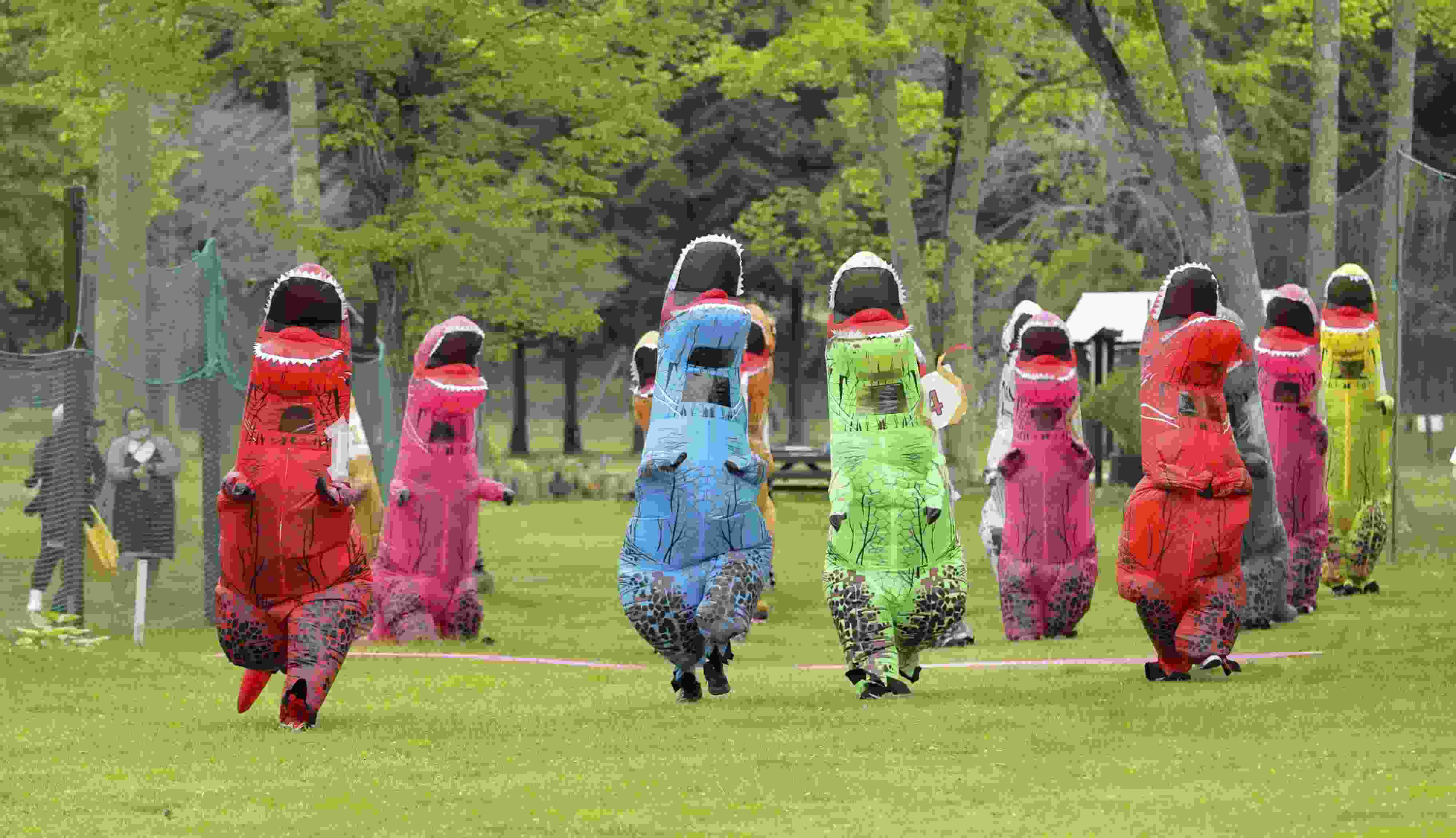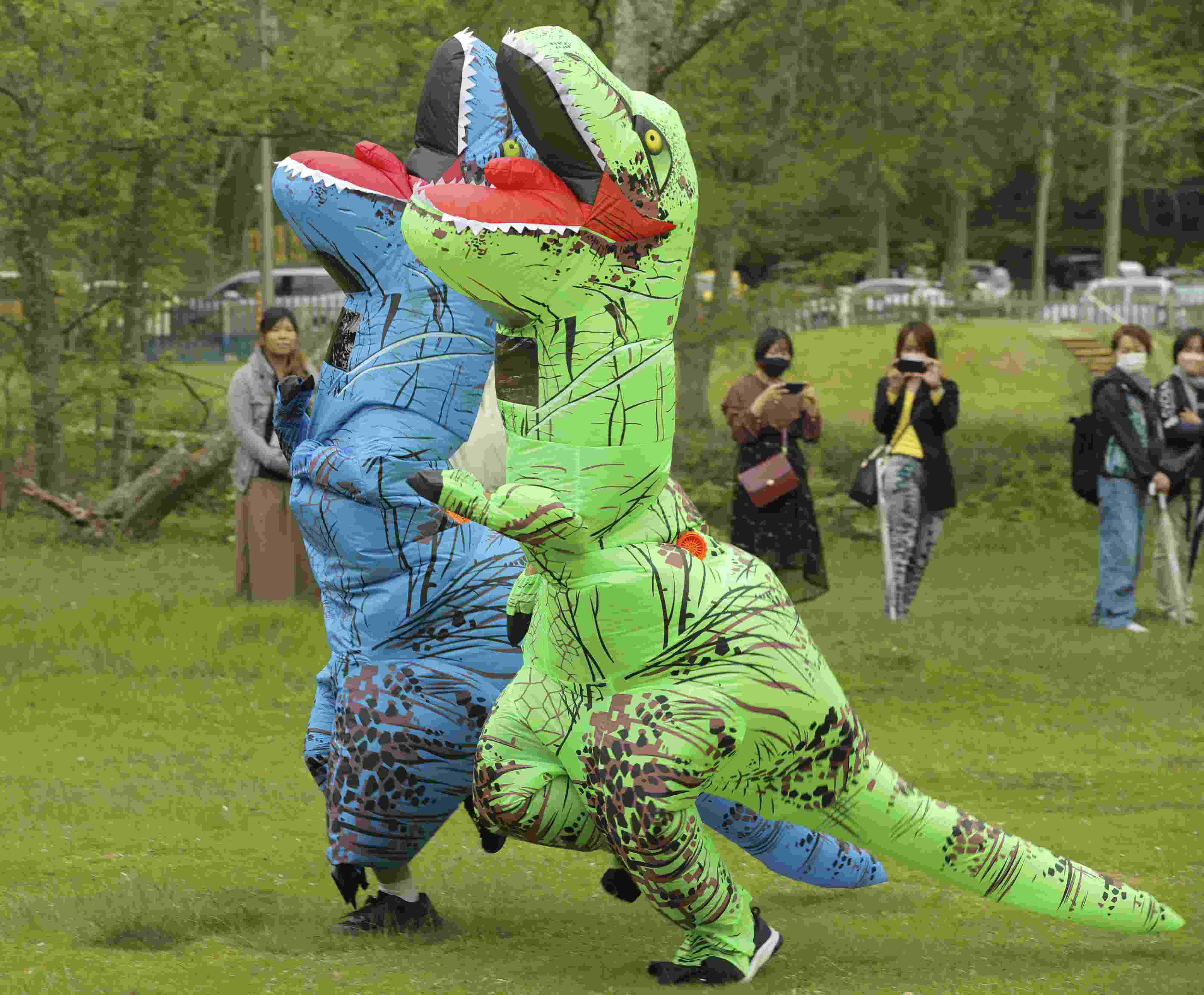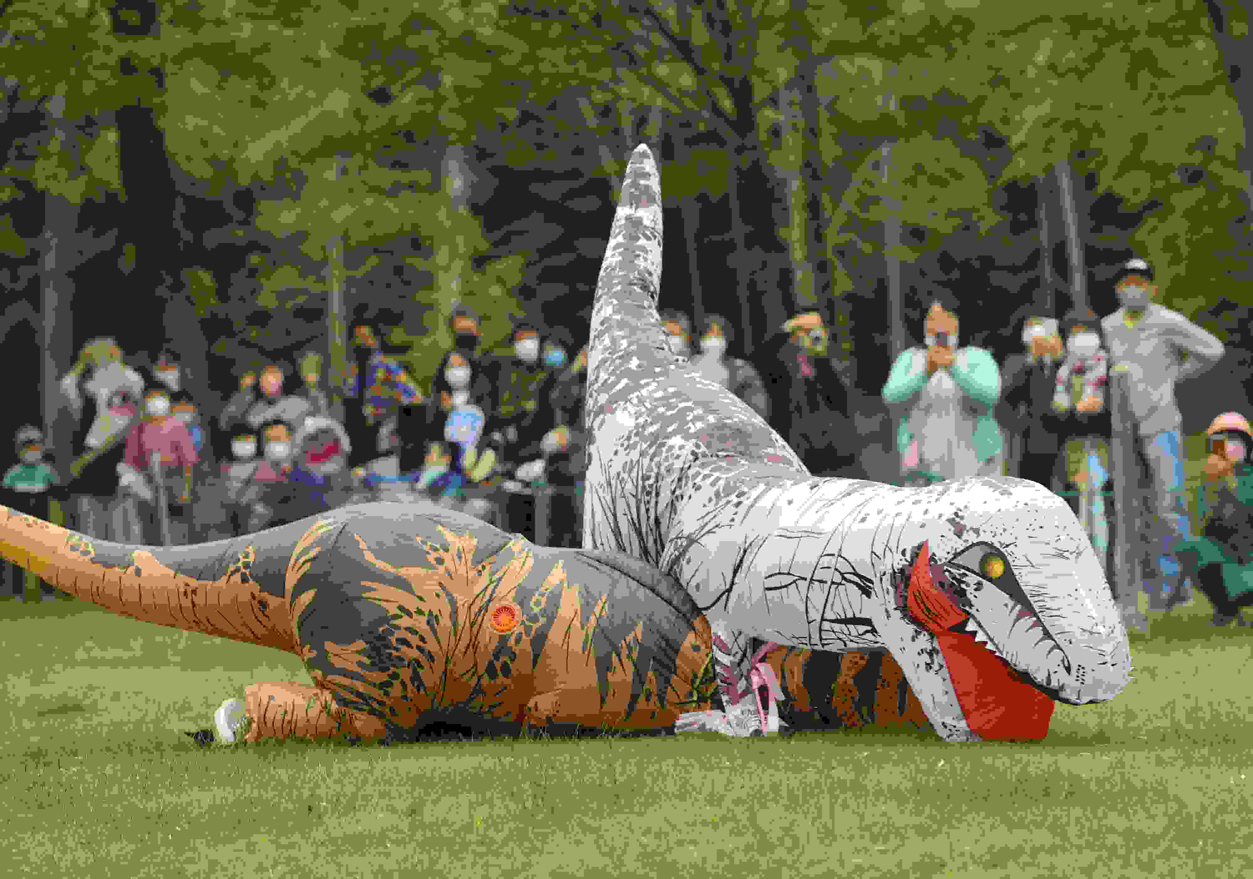 當?shù)貢r間2023年5月28日,日本北海道苫小牧,身穿恐龍服裝的參賽者在約50米長的跑道上賽跑。任何15歲以上的人都可以參加,但他們必須自己置辦恐龍服裝。 視覺中國