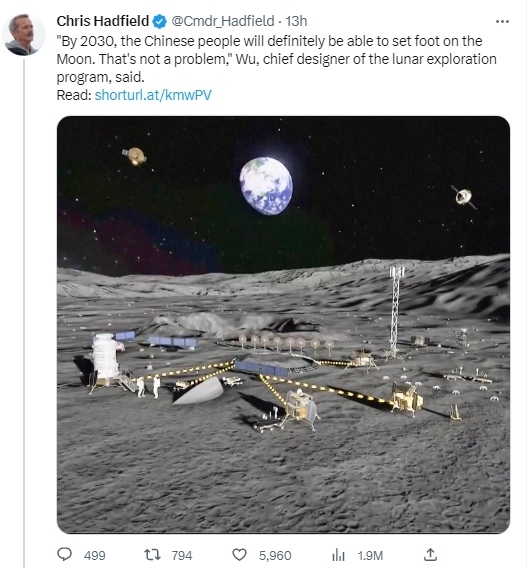 據(jù)報(bào)道,加拿大航天局前宇航員克里斯·哈德菲爾德在社交媒體推特上轉(zhuǎn)發(fā)了CGTN的一篇報(bào)道,他同時(shí)寫(xiě)道,“中國(guó)探月工程總設(shè)計(jì)師吳偉仁說(shuō),‘到2030年,中國(guó)人的足跡一定能夠踏上月球。這不是個(gè)問(wèn)題?!?/p>