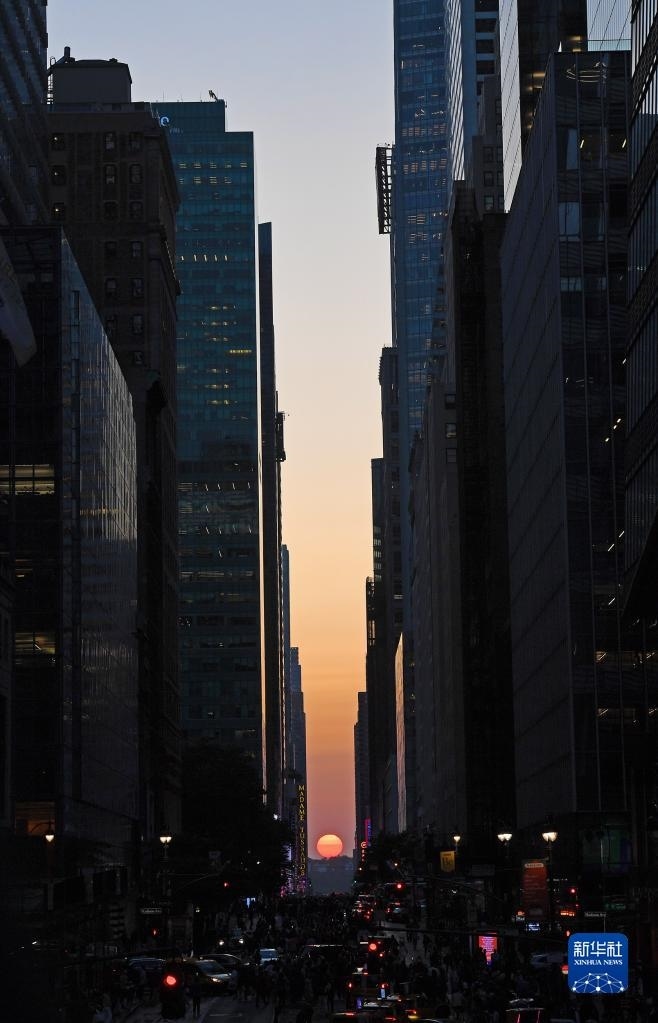 當日,紐約出現(xiàn)“曼哈頓懸日”景觀?!奥D懸日”是紐約市標志性景觀,每年5月和7月出現(xiàn)兩次,指日落時太陽正好出現(xiàn)在曼哈頓東西向街道正上方、似乎懸在兩側高樓大廈之間的戲劇性畫面。新華社記者 李睿 攝