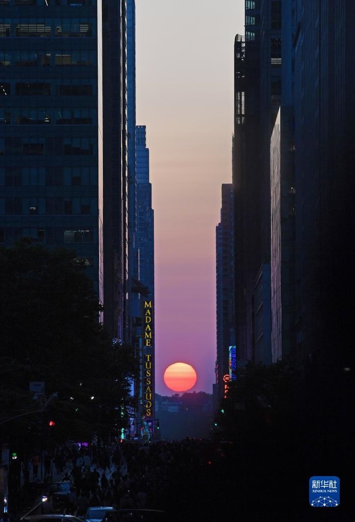當日,紐約出現(xiàn)“曼哈頓懸日”景觀。“曼哈頓懸日”是紐約市標志性景觀,每年5月和7月出現(xiàn)兩次,指日落時太陽正好出現(xiàn)在曼哈頓東西向街道正上方、似乎懸在兩側高樓大廈之間的戲劇性畫面。新華社記者 李睿 攝
