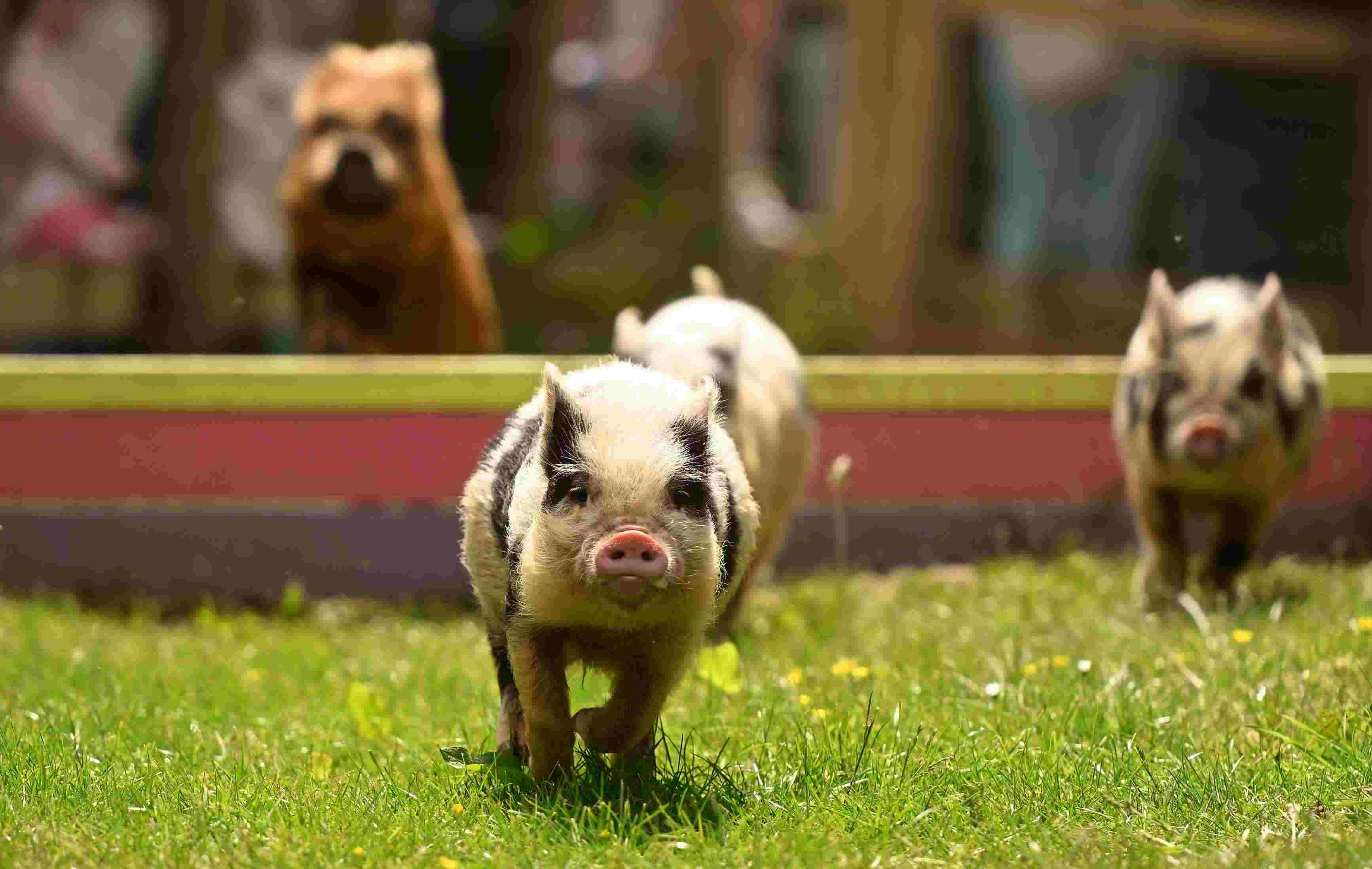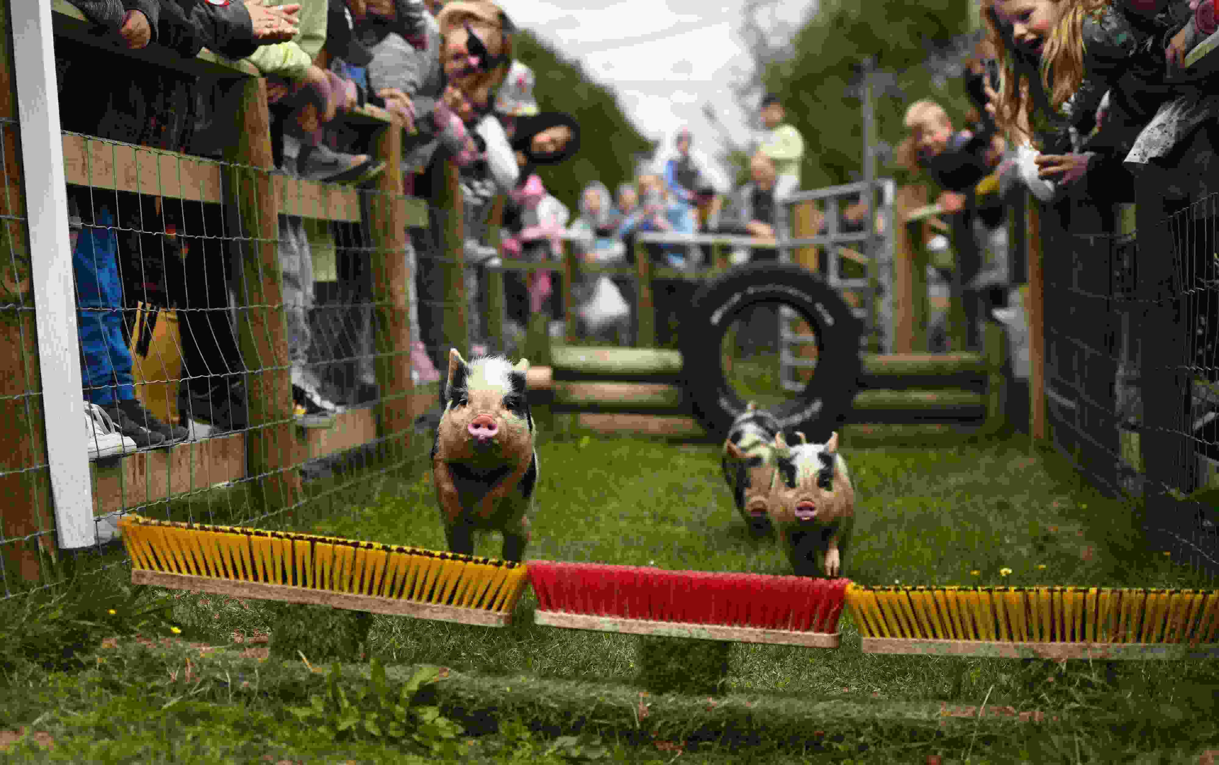 當(dāng)?shù)貢r(shí)間2023年5月31日,英國戴文,當(dāng)?shù)剞r(nóng)場舉行的小豬賽跑活動(dòng),小豬們在賽道上“你追我趕”。 視覺中國