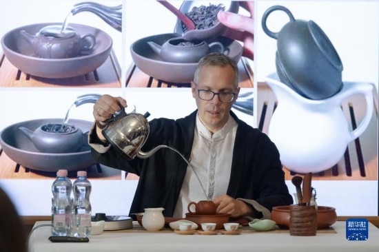 6月1日,在匈牙利布達(dá)佩斯,一名茶文化愛好者在“茶和天下·雅集”活動上向嘉賓展示沖泡中國茶。新華社發(fā)(弗爾季·奧蒂洛攝)