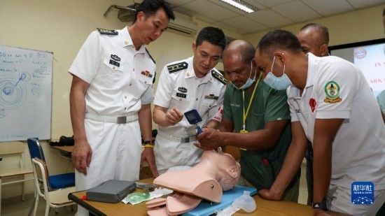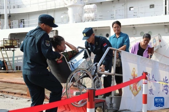 中國海軍“和平方舟”號醫(yī)院船訪問東帝汶并開展醫(yī)療服務期間,醫(yī)院船官兵為當?shù)匦袆硬槐愕幕颊叻眨?月6日攝)。新華社發(fā)(桂江波 攝)