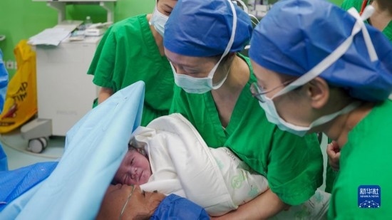中國海軍“和平方舟”號醫(yī)院船執(zhí)行“和諧使命-2023”任務中的第3名“和平寶寶”在東帝汶誕生,新生兒與母親第一次見面(9月5日攝)。新華社發(fā)(李珂嘉賀 攝)