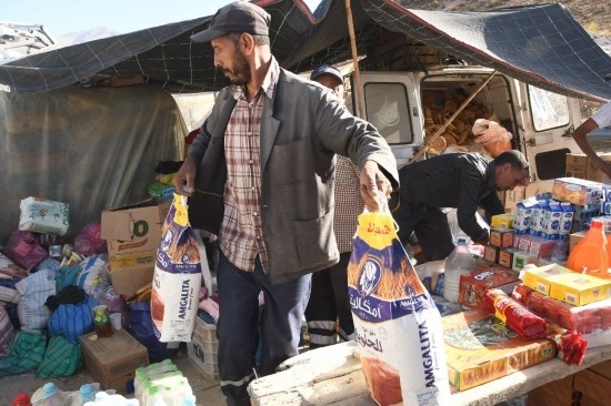 9月10日,在摩洛哥震中附近的艾茲魯村,工作人員分發(fā)救援物資。新華社發(fā)(艾薩攝)