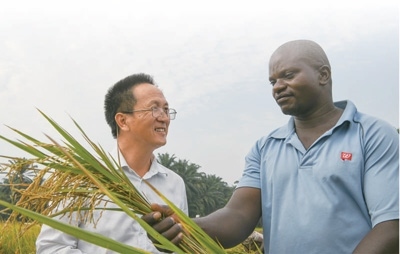 6月20日,在布隆迪布班扎省吉漢加縣,中國農(nóng)業(yè)專家組組長楊華德(左)和當(dāng)?shù)剞r(nóng)民在稻田間交流。新華社記者 韓 旭攝
