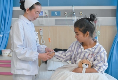 2018年6月,6名柬埔寨先心病患兒在云南省阜外心血管病醫(yī)院接受免費治療。圖為護士為一名患兒檢查身體。任東攝