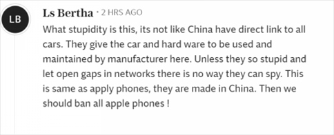 “這是多么愚蠢啊,中國又不是和所有汽車都有直接聯系。他們把汽車和硬件交給這里的制造商使用和維護。除非他們蠢到讓網絡出現漏洞,否則他們不可能進行間諜活動。這和蘋果手機一樣,都是中國制造的。那么我們應該禁止所有蘋果手機!”
