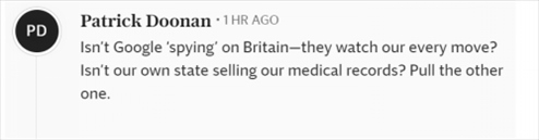還有網友提到美國互聯網巨頭公司,“谷歌不是在‘監(jiān)視’英國嗎——他們監(jiān)視著我們的一舉一動?我們自己的地區(qū)不是在賣我們的醫(yī)療記錄嗎?”