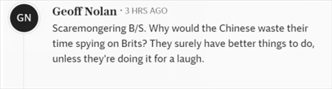 “危言聳聽。中國人為什么要浪費時間監(jiān)視英國人?他們肯定有更好的事情要做,除非他們這么做是為了搞笑。”