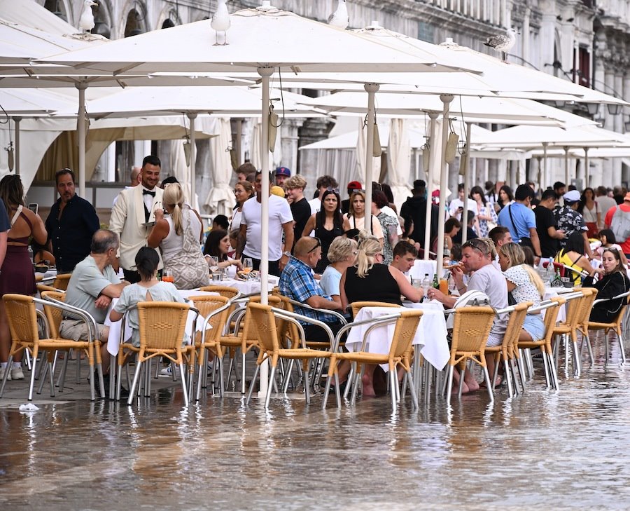 當(dāng)?shù)貢r(shí)間2023年8月4日,意大利威尼斯,游客在圣馬可廣場(chǎng)餐廳。