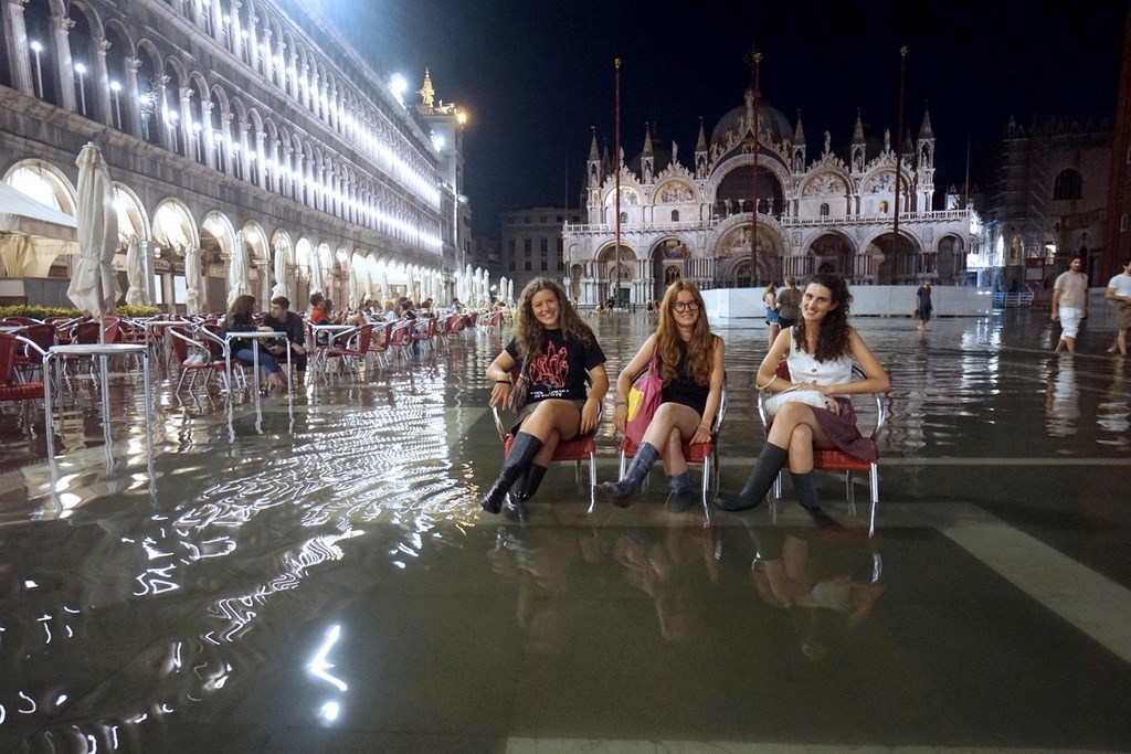 當(dāng)?shù)貢r(shí)間2023年8月2日晚,意大利威尼斯,當(dāng)?shù)爻霈F(xiàn)海水漲潮,游客在水中拍照。