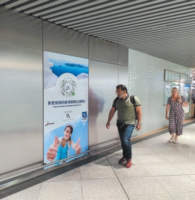 希臘雅典國際機(jī)場內(nèi),旅客走過用中文書寫的廣告海報。本報記者 謝亞宏攝