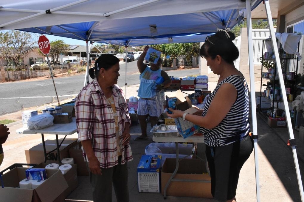 8月22日,在美國(guó)夏威夷州毛伊縣拉海納鎮(zhèn),埃爾琳達(dá)·拉梅布(右)分發(fā)救援物資。新華社發(fā)(曾慧攝)
