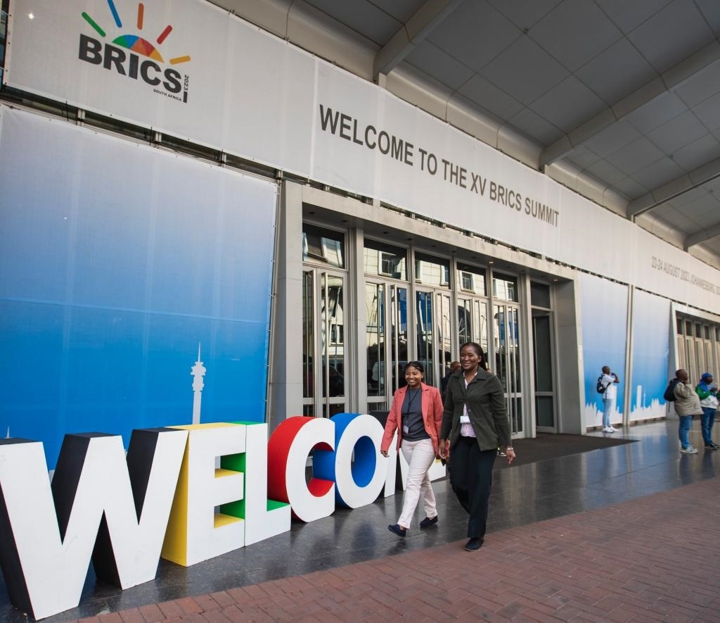 8月21日,在南非約翰內(nèi)斯堡,行人走過金磚國家領(lǐng)導(dǎo)人第十五次會(huì)晤舉辦場(chǎng)所桑頓會(huì)展中心。新華社記者張譽(yù)東攝