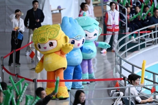 10月7日,杭州亞運(yùn)會吉祥物在女子花樣輪滑單人滑比賽前的暖場活動中。新華社記者 陳曄華 攝