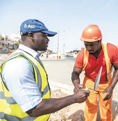 ?塞內(nèi)加爾達(dá)喀爾快速公交項(xiàng)目是塞內(nèi)加爾第一條城市快速公交線路。這條長(zhǎng)約18公里的道路將穿過達(dá)喀爾人口密度最高的社區(qū)和核心商務(wù)區(qū),建成后有助于緩解首都交通壓力。圖為當(dāng)?shù)貑T工在項(xiàng)目建設(shè)工地交流。新華社記者 李亞輝攝