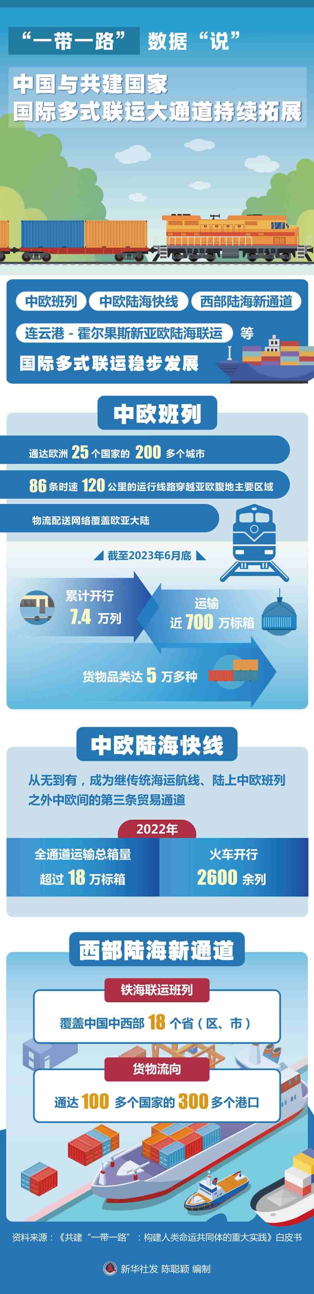 國際多式聯(lián)運大通道持續(xù)拓展。中歐班列、中歐陸??炀€、西部陸海新通道、連云港-霍爾果斯新亞歐陸海聯(lián)運等國際多式聯(lián)運穩(wěn)步發(fā)展。中歐班列通達歐洲25個國家的200多個城市,86條時速120公里的運行線路穿越亞歐腹地主要區(qū)域,物流配送網(wǎng)絡(luò)覆蓋歐亞大陸;截至2023年6月底,中歐班列累計開行7.4萬列,運輸近700萬標箱,貨物品類達5萬多種,涉及汽車整車、機械設(shè)備、電子產(chǎn)品等53大門類,合計貨值超3000億美元。中歐陸??炀€從無到有,成為繼傳統(tǒng)海運航線、陸上中歐班列之外中歐間的第三條貿(mào)易通道,2022年全通道運輸總箱量超過18萬標箱,火車開行2600余列。西部陸海新通道鐵海聯(lián)運班列覆蓋中國中西部18個省(區(qū)、市),貨物流向通達100多個國家的300多個港口。