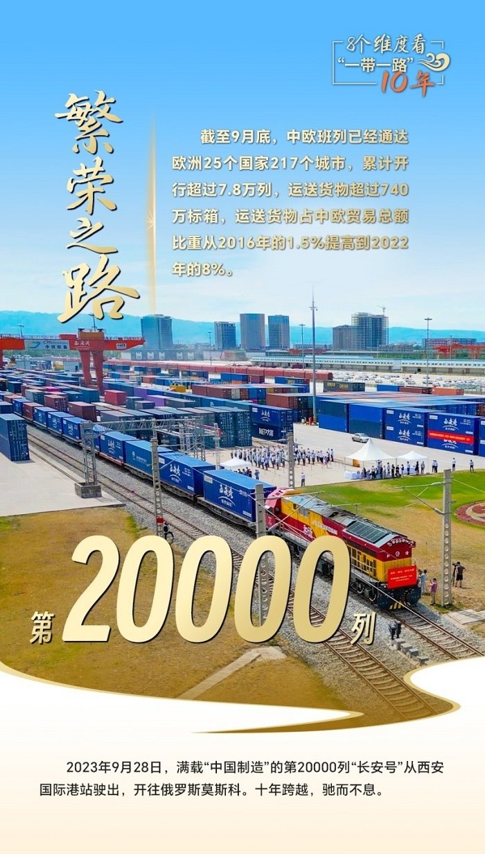 第20000列“長安號(hào)”從西安國際港站駛出,給世界送去“中國制造”;中老鐵路突破重山阻隔,成為國際物流的“黃金通道”;蒙內(nèi)鐵路聯(lián)通東西,是東非鐵路網(wǎng)的開端,更是一條充滿希望的經(jīng)濟(jì)走廊……一個(gè)個(gè)合作豐碑,搭建起高效的貿(mào)易通道網(wǎng)絡(luò)平臺(tái),助力各國走好走穩(wěn)“一帶一路”這條繁榮之路。