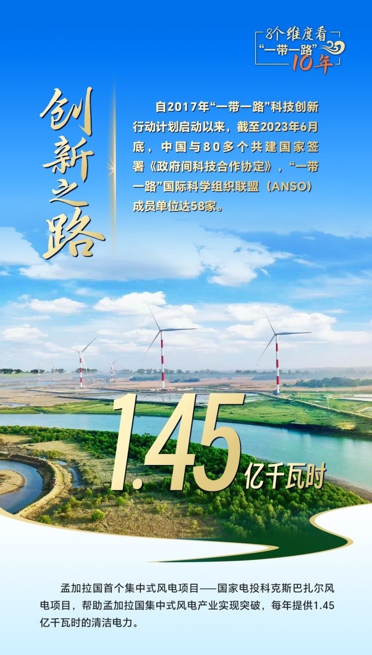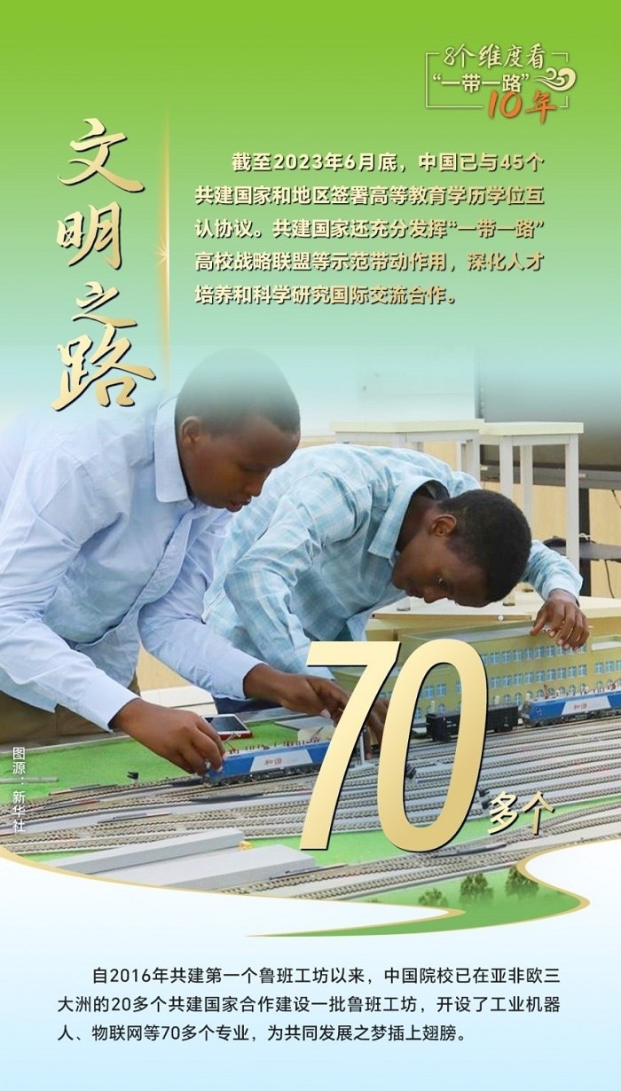 10年來,創(chuàng)新始終是一個(gè)關(guān)鍵詞,中國與共建國家加強(qiáng)科技創(chuàng)新合作,加速集聚創(chuàng)新資源,為共建“一帶一路”注入強(qiáng)勁動(dòng)力。截至2023年6月底,中國與80多個(gè)共建國家簽署《政府間科技合作協(xié)定》,“一帶一路”國際科學(xué)組織聯(lián)盟(ANSO)成員單位達(dá)58家;2013年以來,中國支持逾萬名共建國家青年科學(xué)家來華開展短期科研工作和交流,累計(jì)培訓(xùn)共建國家技術(shù)和管理人員1.6萬余人次;累計(jì)幫助50多個(gè)非洲國家建成20多個(gè)農(nóng)業(yè)技術(shù)示范中心,在農(nóng)業(yè)、新能源、衛(wèi)生健康等領(lǐng)域啟動(dòng)建設(shè)50余家“一帶一路”聯(lián)合實(shí)驗(yàn)室。