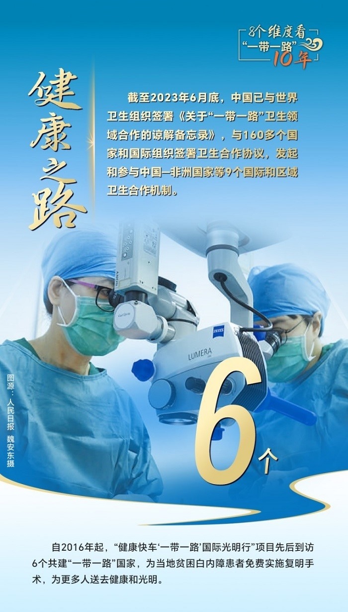 截至2023年6月底,中國已與世界衛(wèi)生組織簽署《關(guān)于“一帶一路”衛(wèi)生領(lǐng)域合作的諒解備忘錄》,與160多個(gè)國家和國際組織簽署衛(wèi)生合作協(xié)議,發(fā)起和參與中國—非洲國家、中國—阿拉伯國家、中國—東盟衛(wèi)生合作等9個(gè)國際和區(qū)域衛(wèi)生合作機(jī)制。為共建國家培養(yǎng)數(shù)萬名衛(wèi)生管理、公共衛(wèi)生、醫(yī)學(xué)科研等專業(yè)人才,向58個(gè)國家派出中國醫(yī)療隊(duì),赴30多個(gè)國家開展“光明行”,免費(fèi)治療白內(nèi)障患者近萬名,與湄公河流域國家、中亞國家、蒙古國等周邊國家開展跨境醫(yī)療合作,衛(wèi)生健康合作成效顯著。
