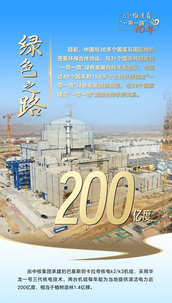 十年來,“綠色絲綢之路”建設(shè)取得豐碩成果。中國已與30多個(gè)國家及國際組織簽署環(huán)保合作協(xié)議,與31個(gè)國家共同發(fā)起“一帶一路”綠色發(fā)展伙伴關(guān)系倡議,與32個(gè)國家建立“一帶一路”能源合作伙伴關(guān)系。
