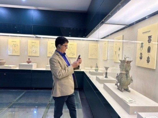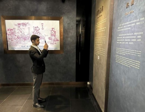 10月23日,2023“一帶一路”媒體合作論壇聯(lián)合采訪團團員在中國酒文化城認真觀看展覽。本報記者 劉書文攝