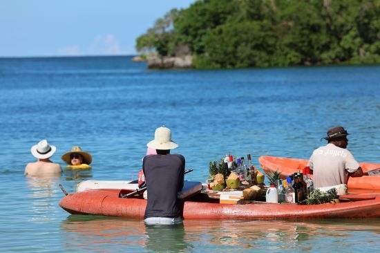 商販們推著載滿(mǎn)貨物的小船在海水里等待生意。唐薇 攝