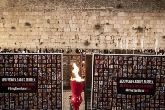 這是11月7日在耶路撒冷老城“哭墻”前拍攝的以色列被扣押人員海報(bào)。新華社記者 陳君清 攝