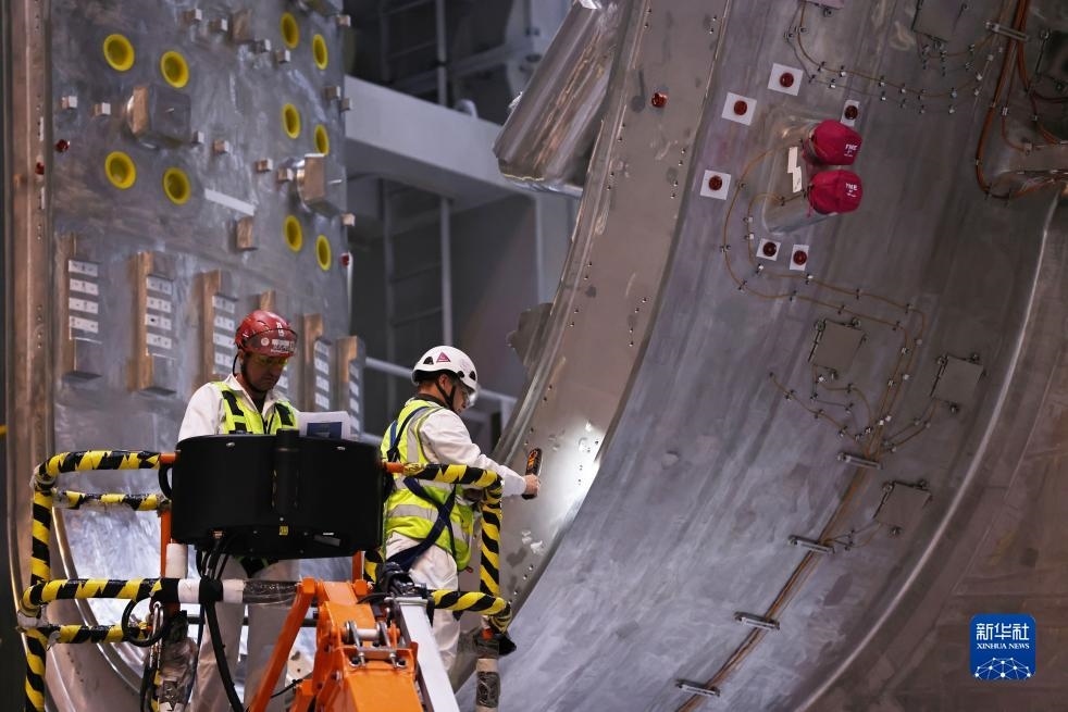 ?這是11月23日在位于法國圣保羅-萊迪朗斯的國際熱核聚變實驗反應堆(ITER)預組裝大廳內(nèi)拍攝的接受檢查的超大型設備。新華社記者 高靜 攝