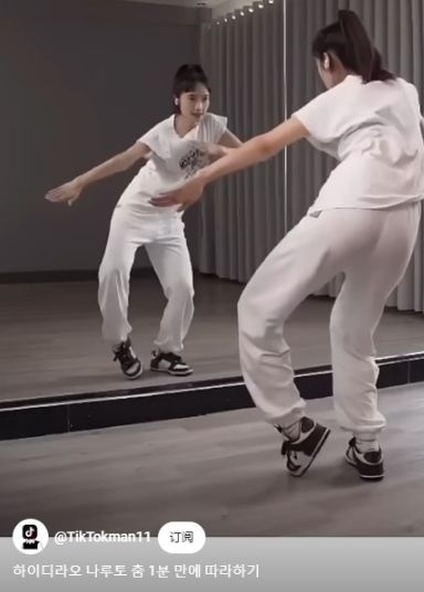 圖為韓國博主錄制教學(xué)視頻,手把手教跳“科目三”。圖片來源:社交媒體截圖