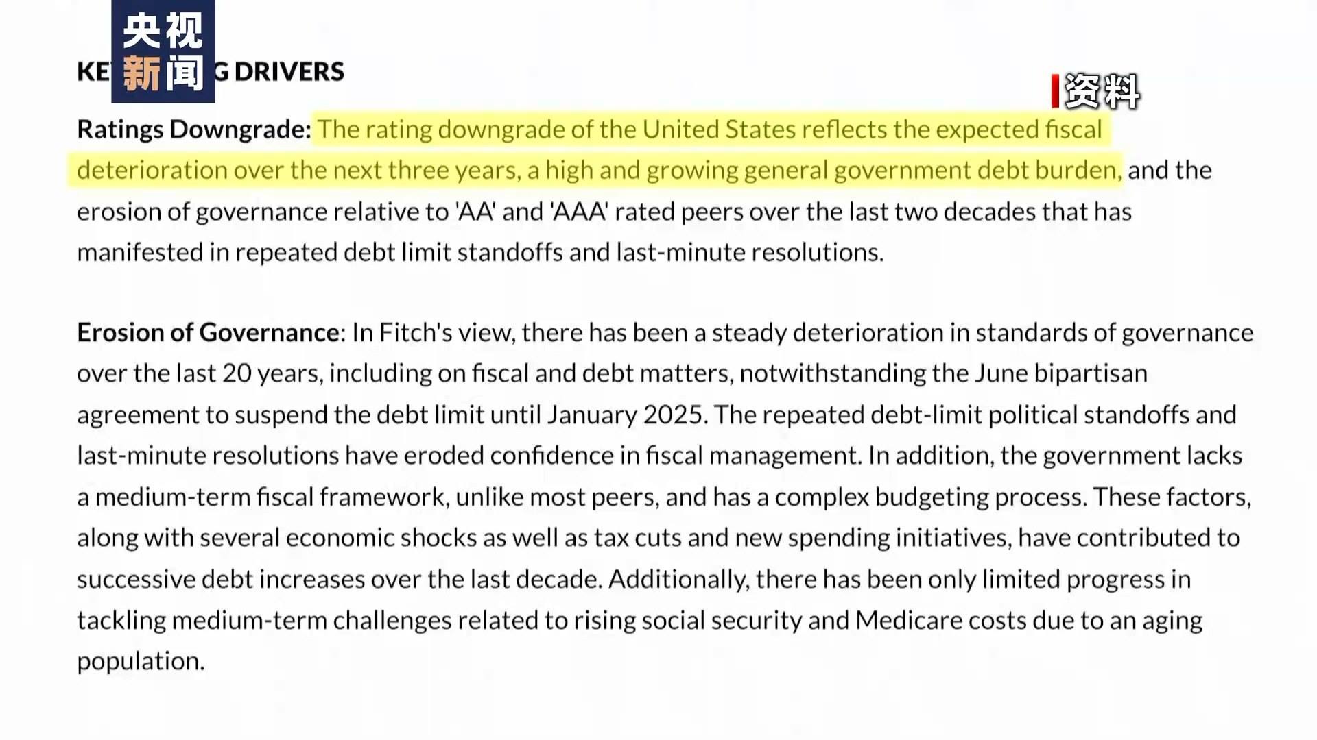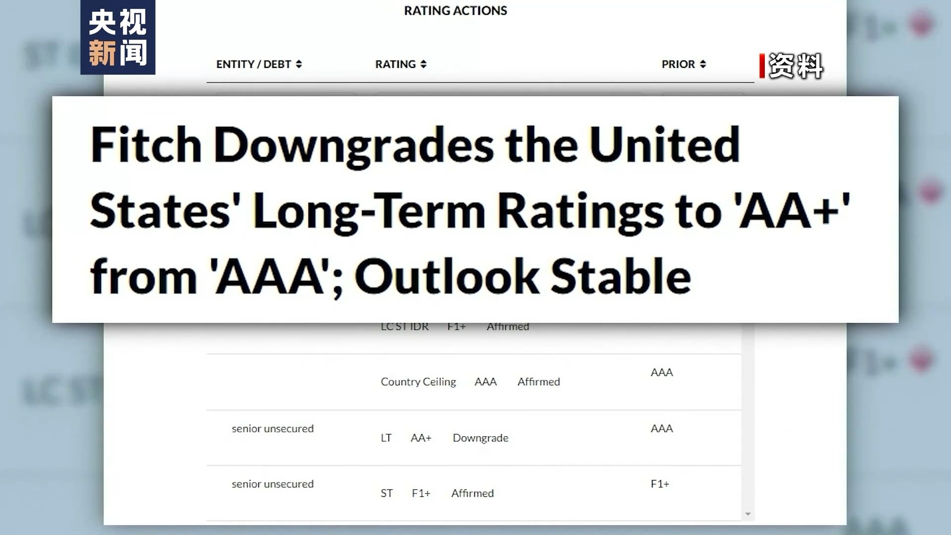 到了2023年8月1日,國際評級機(jī)構(gòu)惠譽(yù)將美國長期外幣發(fā)行人違約評級從AAA下調(diào)至AA+。惠譽(yù)當(dāng)天發(fā)表聲明說,下調(diào)美國信用評級主要由于美國政府債務(wù)負(fù)擔(dān)居高不下且不斷加重,未來3年財(cái)政狀況預(yù)計(jì)將持續(xù)惡化。