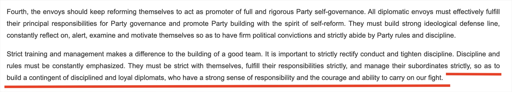 “鐵軍”一詞常見于政府文件或領(lǐng)導(dǎo)人講話,更多的是強(qiáng)調(diào)工作作風(fēng)和紀(jì)律。在近年來中國領(lǐng)導(dǎo)人講話中,曾多次出現(xiàn)“紀(jì)律監(jiān)察鐵軍”“生態(tài)環(huán)境保護(hù)鐵軍”等表述。中國領(lǐng)導(dǎo)人在接見與會使節(jié)時(shí)的講話中說:“打造一支對黨忠誠、勇于擔(dān)當(dāng)、敢斗善斗、紀(jì)律嚴(yán)明的外交鐵軍?!蓖饨徊烤W(wǎng)站對這句話的英文翻譯(見下圖)同樣強(qiáng)調(diào)外交隊(duì)伍的紀(jì)律、責(zé)任和勇氣。作為通行做法,世界各國對本國外交人員都有著很高的紀(jì)律要求。