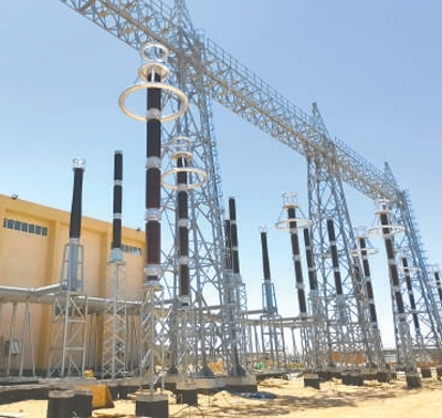 位于蘇伊士省的??怂_迪亞500千伏變電站項(xiàng)目現(xiàn)場(chǎng),鐵塔高聳,一條條高壓輸電導(dǎo)線(xiàn)接入變電站設(shè)備,電流通過(guò)導(dǎo)線(xiàn)時(shí)發(fā)出嗡嗡聲。