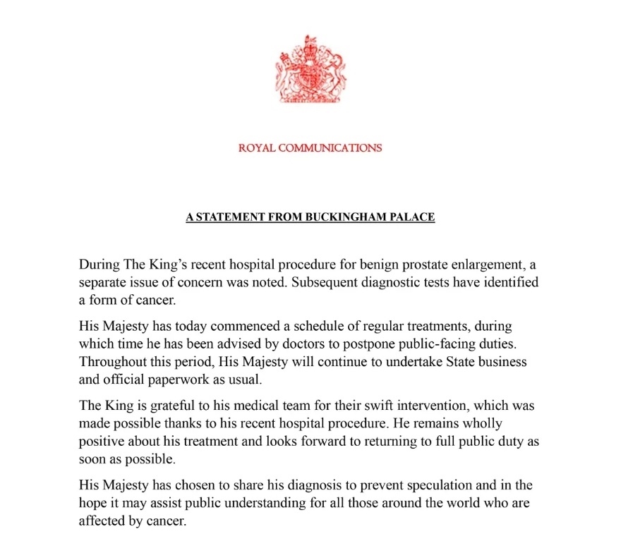 當地時間2月5日,白金漢宮發(fā)布消息稱,英國國王查爾斯三世在醫(yī)院的診斷檢查中被確診患有癌癥。
