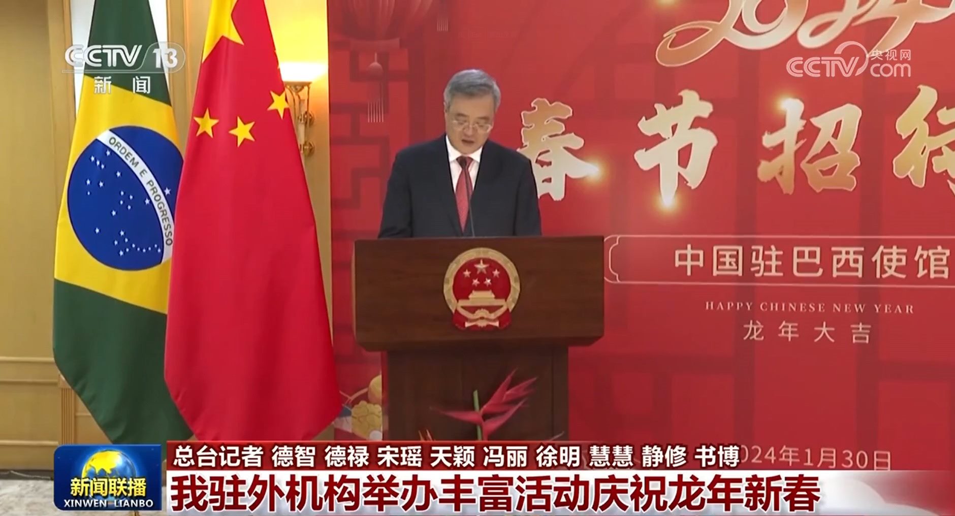 央視網(wǎng)消息(新聞聯(lián)播):連日來,我駐國際組織代表團和駐多國使館舉辦春節(jié)招待會等活動,共慶龍年新春。