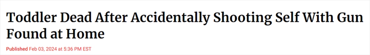 美國疾病控制與預防中心(CDC)的數(shù)據(jù)顯示,“意外傷害是造成美國0至17歲未成年人死亡的主要原因,而槍支是主要的傷害方式”,其中超半數(shù)的意外槍擊事件發(fā)生在家中。