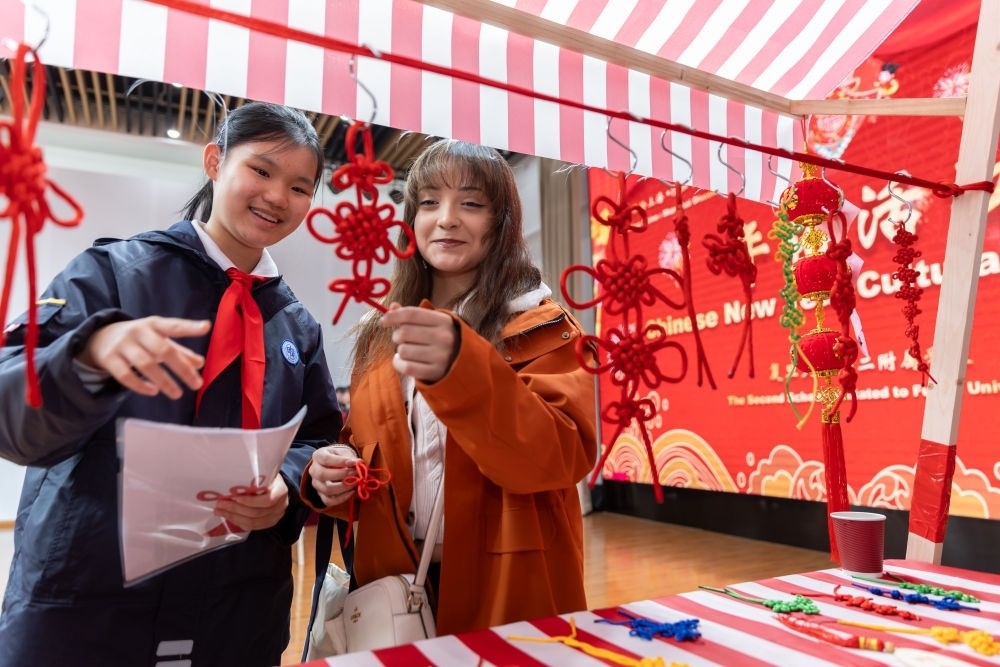 1月28日,復(fù)旦大學(xué)第二附屬學(xué)校學(xué)生(左)為馬斯卡廷學(xué)生(右)介紹中國(guó)結(jié)。