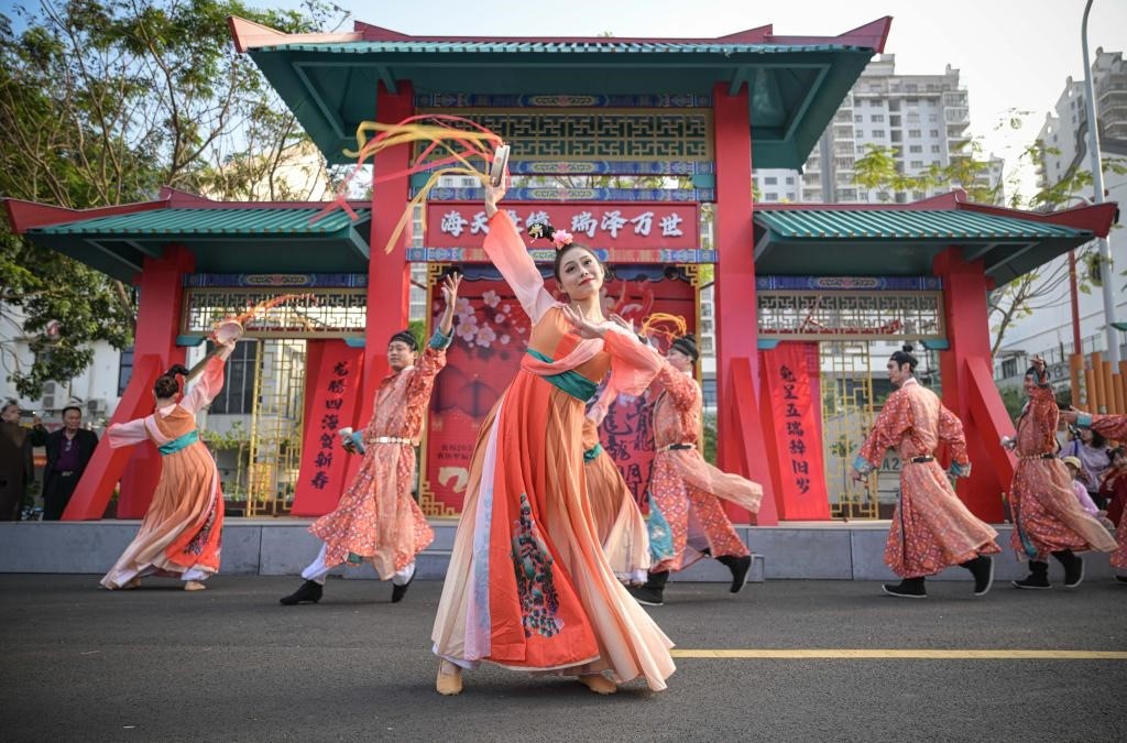 2月12日,在位于海南省??谑械牡谑鶎萌f(wàn)春會(huì)分會(huì)場(chǎng)——海瑞文化公園春節(jié)系列活動(dòng)中拍攝的舞蹈演藝現(xiàn)場(chǎng)。新華社記者蒲曉旭攝