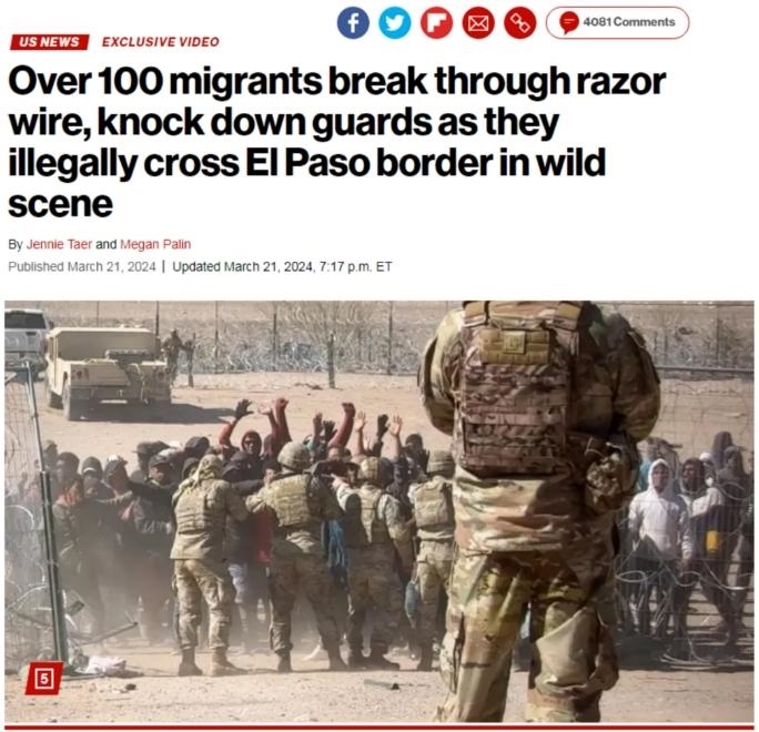 中新網(wǎng)3月22日電 綜合外媒報道,當(dāng)?shù)貢r間21日,在得克薩斯州邊境墻附近,有上百名非法移民沖破鐵絲網(wǎng)試圖非法進(jìn)入美國。他們撞倒得州國民警衛(wèi)隊成員,試圖越過美墨邊境,場面一度十分混亂。
