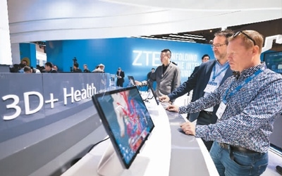 2月28日,西班牙巴塞羅那舉行的2024年世界移動通信大會上,一名參觀者在中興展臺體驗全新升級的5G+人工智能裸眼3D平板電腦。新華社記者 高 靜攝
