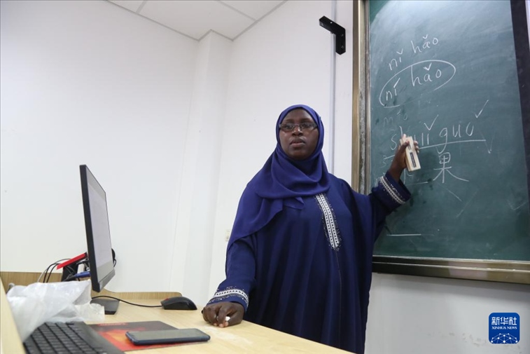 2023年11月17日,在坦桑尼亞達累斯薩拉姆大學(xué)孔子學(xué)院,本土中文教師在給學(xué)生授課。新華社發(fā)(赫爾曼·埃馬紐埃爾攝)