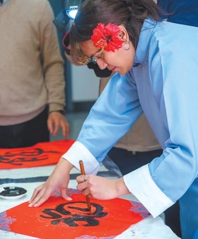 安雅在學校為留學生舉辦的新春活動上用毛筆書寫“?!弊帧J茉L者供圖