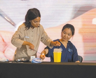 在2023年舉行的第二十二屆“漢語(yǔ)橋”世界大學(xué)生中文比賽南非賽區(qū)決賽中,來(lái)自西開(kāi)普大學(xué)中醫(yī)孔子學(xué)院的學(xué)生希諾(左)展示針灸治療。 本報(bào)記者 鄒 松攝