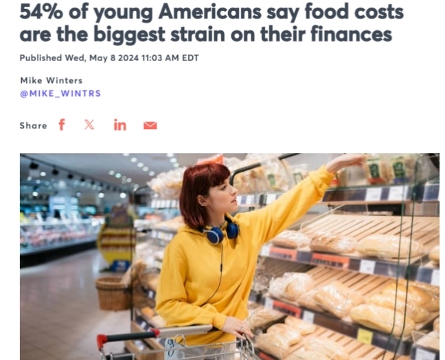中國(guó)日?qǐng)?bào)網(wǎng)5月10日電 ?當(dāng)?shù)貢r(shí)間5月8日,美國(guó)財(cái)經(jīng)網(wǎng)站CNBC報(bào)道,一項(xiàng)調(diào)查顯示,年輕的美國(guó)人正在感受通貨膨脹帶來(lái)的壓力,54%的受訪者表示食品價(jià)格上升對(duì)他們的打擊最大。